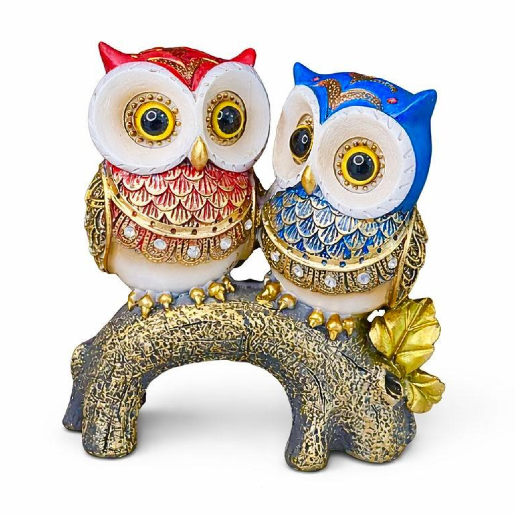 PRODUTO: Estátua em Resina Corujas Vermelha e Azul 13cm