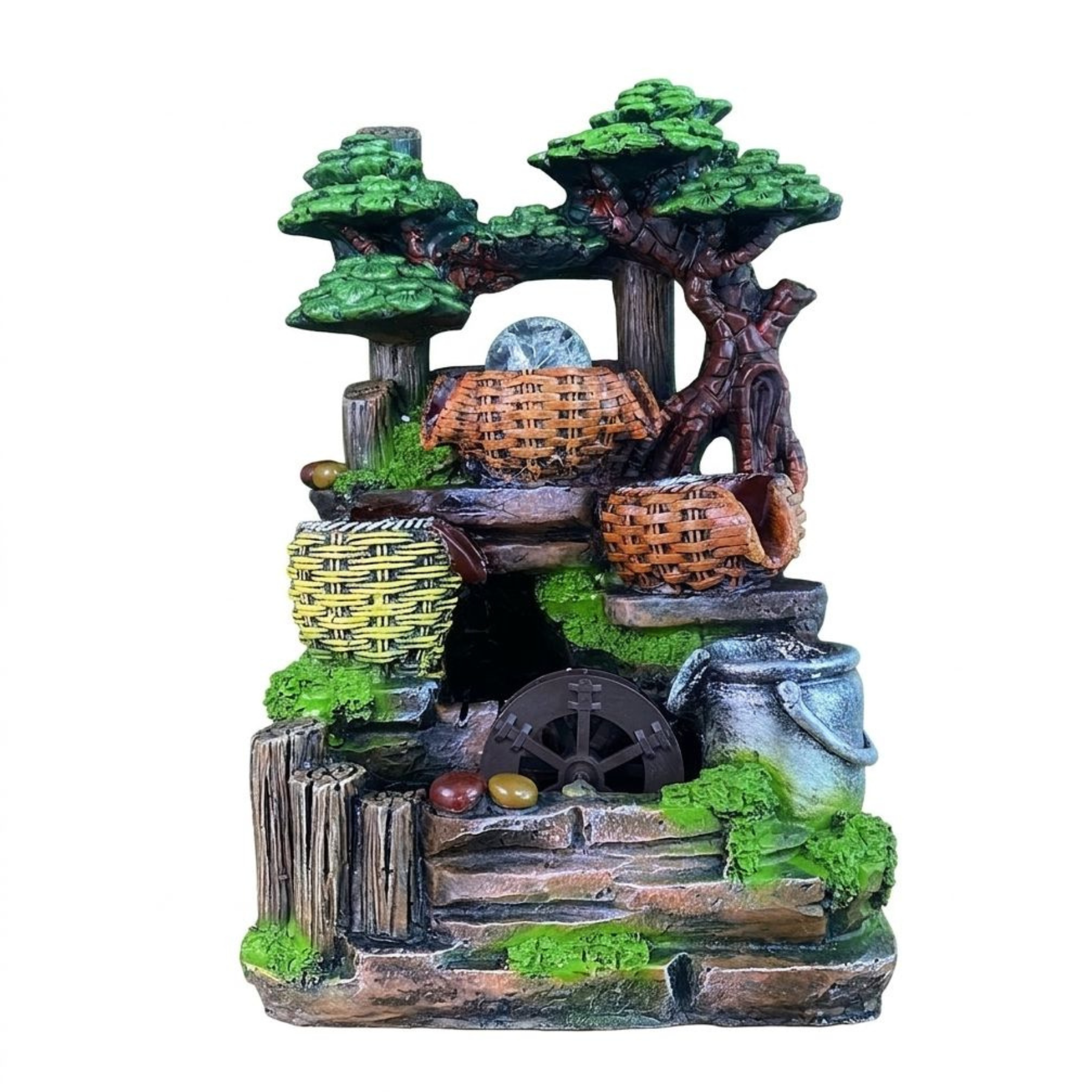 Esta fonte de água decorativa apresenta um cenário rústico e detalhado que remete à tranquilidade de uma vila no campo, ideal para criar um ambiente relaxante. A peça é composta por elementos que simulam a natureza, como árvores de copas verdes e musgo, intercalados com cestos de vime e um balde metálico por onde a água flui suavemente. No centro, uma roda d'água funcional e uma esfera de cristal proporcionam movimento dinâmico.