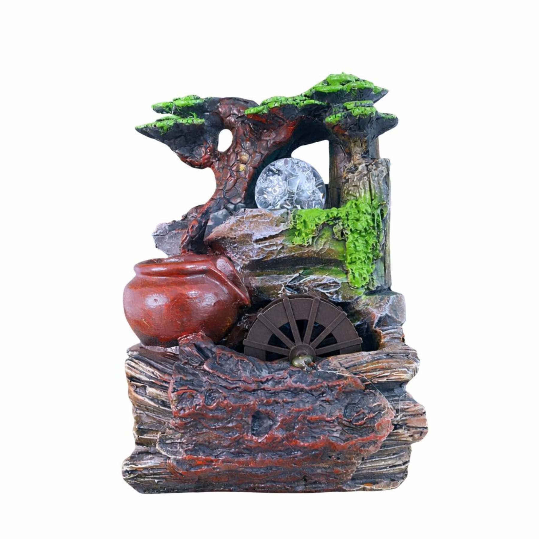 Este encantador enfeite decorativo em forma de fonte traz um design rústico e acolhedor, inspirado em elementos naturais e campestres. Com jarros detalhados, uma pequena roda d’água e texturas que remetem à madeira e à vegetação, a peça cria um visual harmonioso e cheio de personalidade. A esfera no topo adiciona um toque especial e sofisticado, enquanto o conjunto transmite sensação de tranquilidade e bem-estar. Ideal para decorar ambientes internos como salas, escritórios ou espaços de relaxamento, é perfeito para quem busca um detalhe único que une beleza e serenidade na decoração.
