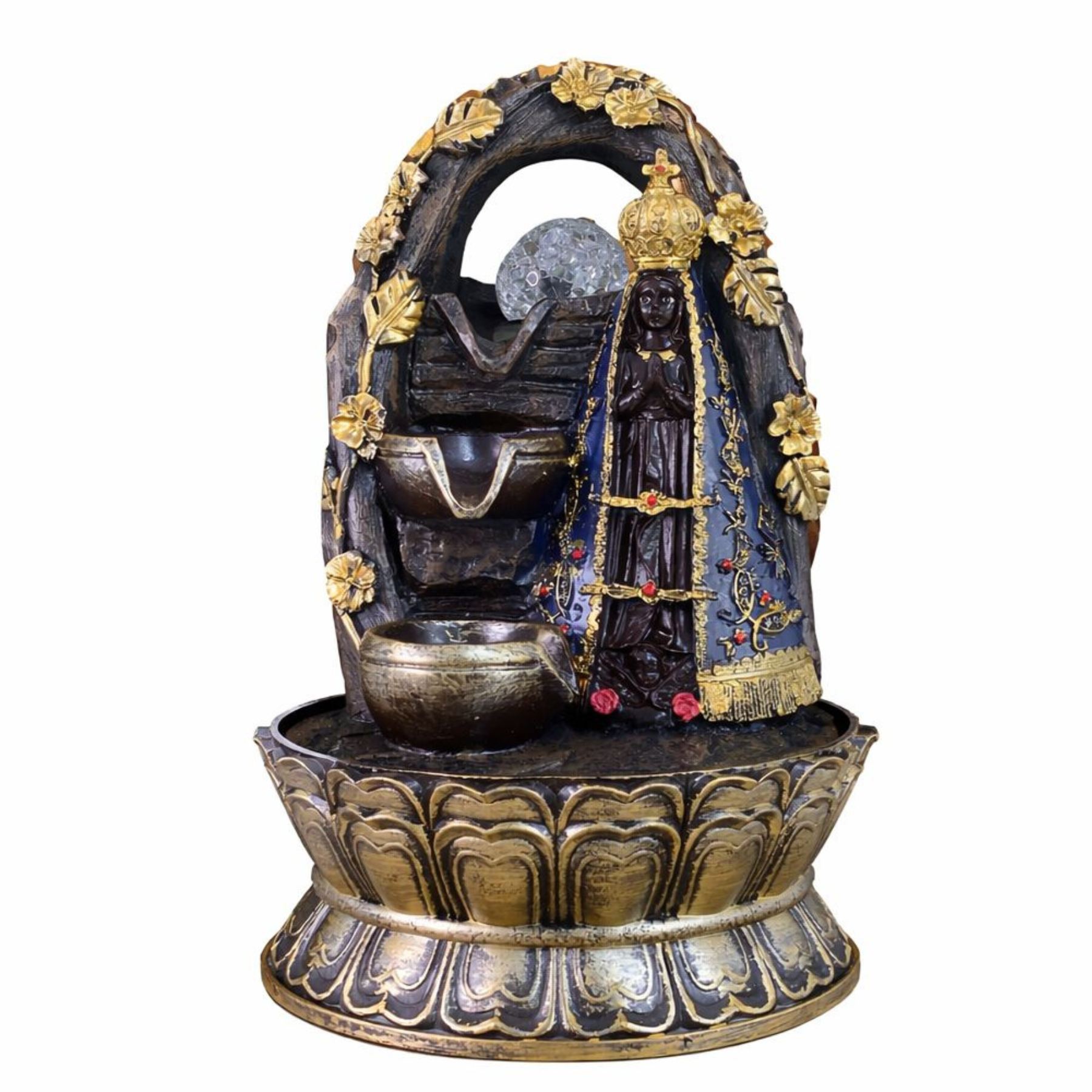 Esta fonte de água decorativa une a devoção religiosa à estética rústica e elegante. No centro, destaca-se uma representação de Nossa Senhora Aparecida com sua coroa dourada e o manto azul ricamente detalhado, com aplicações em dourado e pequenas pedras vermelhas, transmitindo sacralidade. A estrutura principal simula um arco de tronco de árvore texturizado, adornado com folhas e flores douradas que envolvem a cena. À esquerda da imagem sagrada, um sistema de cascata com duas cuias sobrepostas direciona o fluxo da água, que é acentuado por uma esfera de vidro transparente no topo, sugerindo movimento e luz. Toda a composição repousa sobre uma base robusta em formato de cálice, decorada com relevos em pátina dourada e envelhecida, que evocam pétalas de flor de lótus, conferindo estabilidade e um toque oriental ao design.