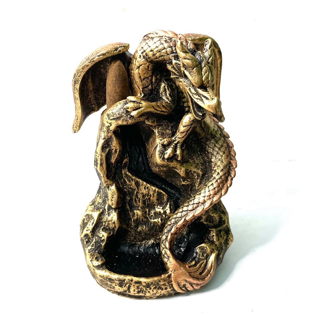 O Incensário Cascata Dragão Dourado é projetado para criar um efeito visual impressionante. Quando o incenso em cone é aceso, a fumaça desce suavemente, criando uma cascata mágica que flui ao redor da figura do dragão. Esta peça é perfeita para quem aprecia a estética esotérica e deseja adicionar um toque de magia ao seu espaço.