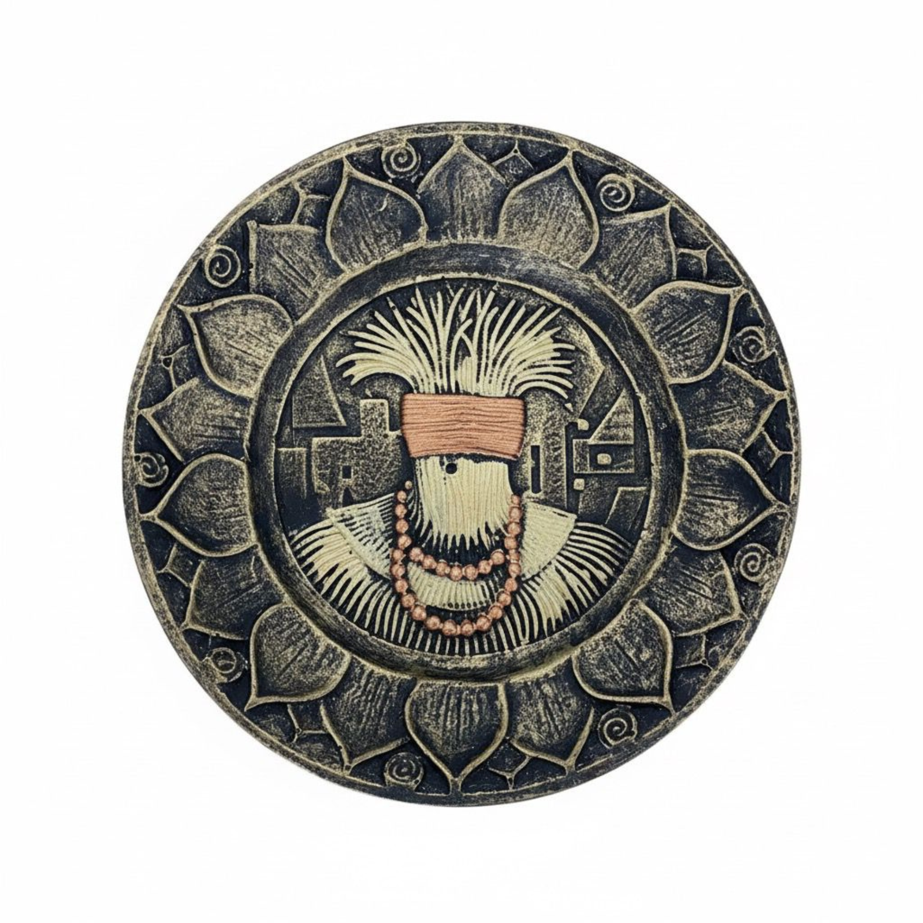 Este incensário em formato de pratinho apresenta o orixá Omulu, também conhecido como Obaluaiê, Senhor da Terra, da cura e das doenças, numa representação estilizada e poderosa. O destaque central é a figura do orixá, coberta pela simbólica palha da costa, que lhe confere mistério e proteção, ocultando seu corpo. Sobre a palha, uma faixa de cor cobre ou terrosa cobre a área dos olhos, e um colar de miçangas em tom de bronze ou rosado adorna seu pescoço, representando suas "pérolas" e sua ligação com a riqueza da terra. A imagem é emoldurada por uma borda com padrões que remetem a pétalas de lótus ou flores, evocando o ciclo de vida, morte e regeneração que Omulu rege. O acabamento com tonalidades escuras e pátina dourada ou bronze envelhecido confere à peça um aspecto sóbrio e ancestral, ideal para rituais de defumação e reverência a este Orixá de grande poder.
