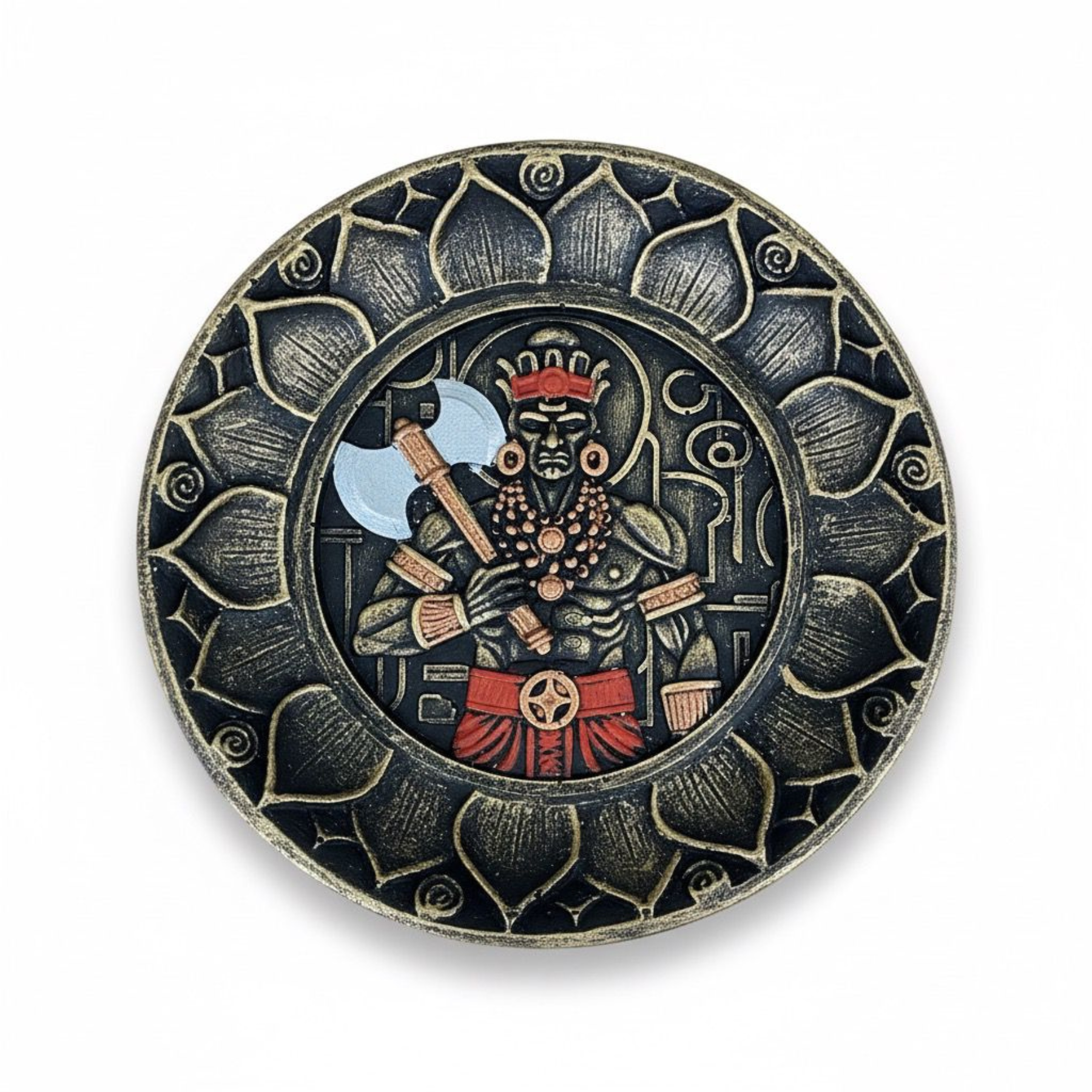 Este incensário em formato de pratinho presta homenagem a Xangô, o orixá da justiça, do fogo, do trovão e das pedreiras. A imagem central representa Xangô em toda sua força e realeza guerreira, com o corpo robusto adornado por colares de contas nas cores vermelha e branca. Sua vestimenta é marcada por detalhes em vermelho, a cor do fogo e da paixão, e ele porta seu instrumento de poder, o Oxé (machado de duas lâminas), que simboliza a dualidade da justiça, que tanto protege quanto pune. A expressão em seu rosto é séria e imponente, refletindo sua incorruptibilidade e a importância de suas leis. O medalhão é emoldurado por uma borda em alto-relevo de pétalas de lótus, com um acabamento em pátina escura e dourada/bronze envelhecido, conferindo à peça um aspecto ancestral e majestoso, ideal para rituais de firmeza, para buscar a verdade e invocar a equidade de Xangô.