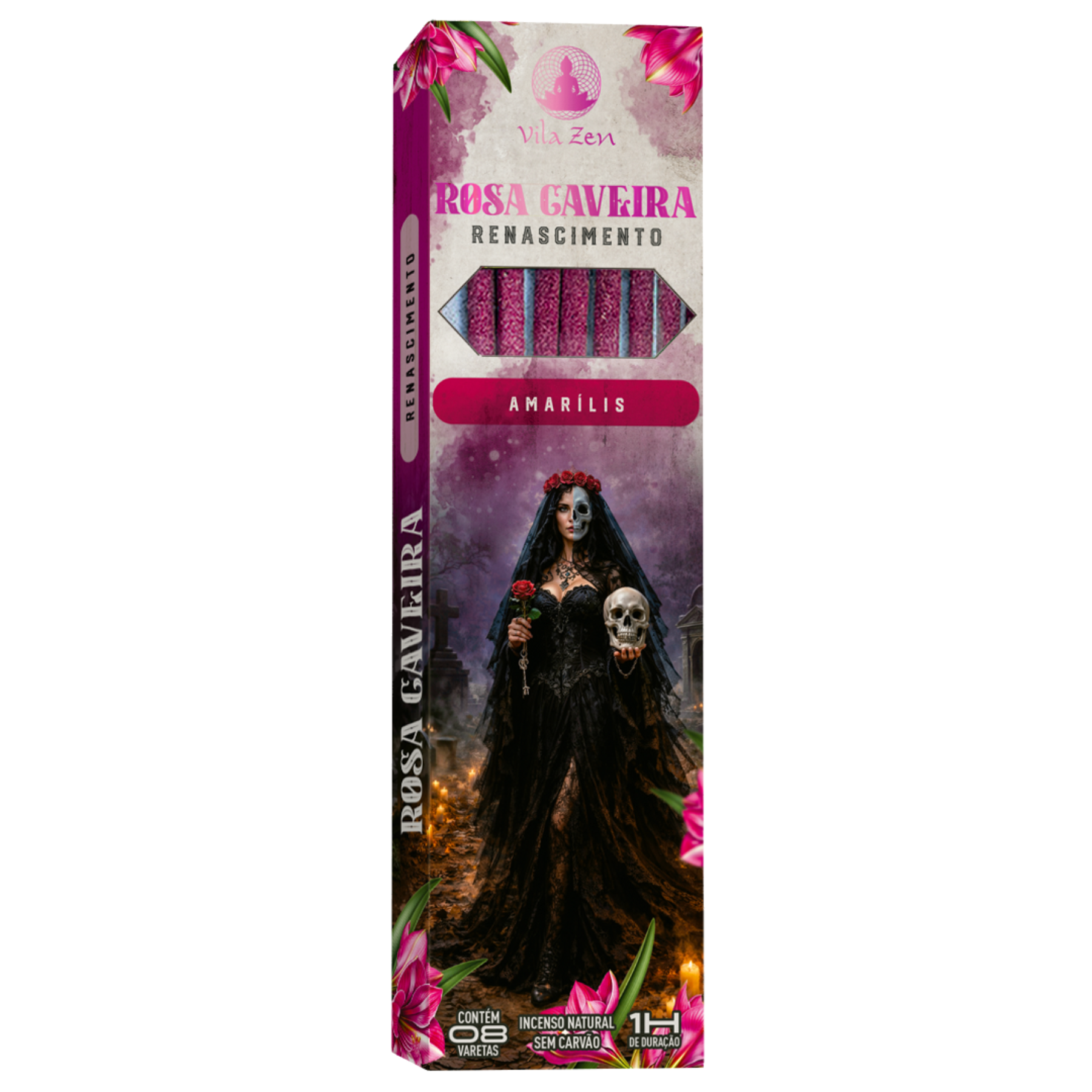 O incenso de Amarílis da linha Rosa Caveira é uma fragrância profunda e mística, consagrada para rituais de renascimento e transformação espiritual. Seu aroma floral intenso e sofisticado atua no desapego de velhos padrões e no encerramento de ciclos negativos, trazendo a força necessária para que o novo possa florescer com elegância e determinação. Por ser um incenso natural e livre de carvão, ele oferece uma queima limpa de até uma hora, sendo ideal para momentos de renovação interior, superação de lutos simbólicos ou para purificar o ambiente de energias estagnadas, permitindo que a beleza da resiliência e a sabedoria da alma se manifestem plenamente.