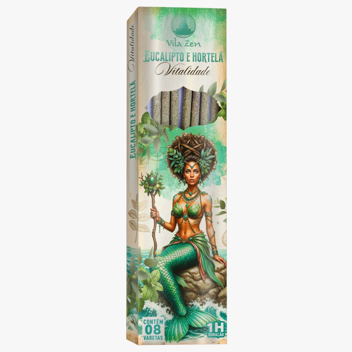 O Incenso em Varetas Eucalipto e Hortelã Vitalidade da marca Via Zen é um produto natural e refrescante, formulado com a intenção de revigorar e promover a Vitalidade, a energia e a clareza mental. Sua embalagem apresenta uma sereia em tons de verde e um cenário de mata atlântica, destacando os elementos de Eucalipto e Hortelã, o que sugere um aroma herbal, mentolado e purificante, ideal para despertar a mente, renovar o ar e afastar a preguiça ou o cansaço. Cada caixa contém 08 varetas de queima prolongada (aproximadamente 1 hora de duração), sendo perfeitas para iniciar o dia com disposição ou para revigorar o ambiente após longas horas de trabalho.