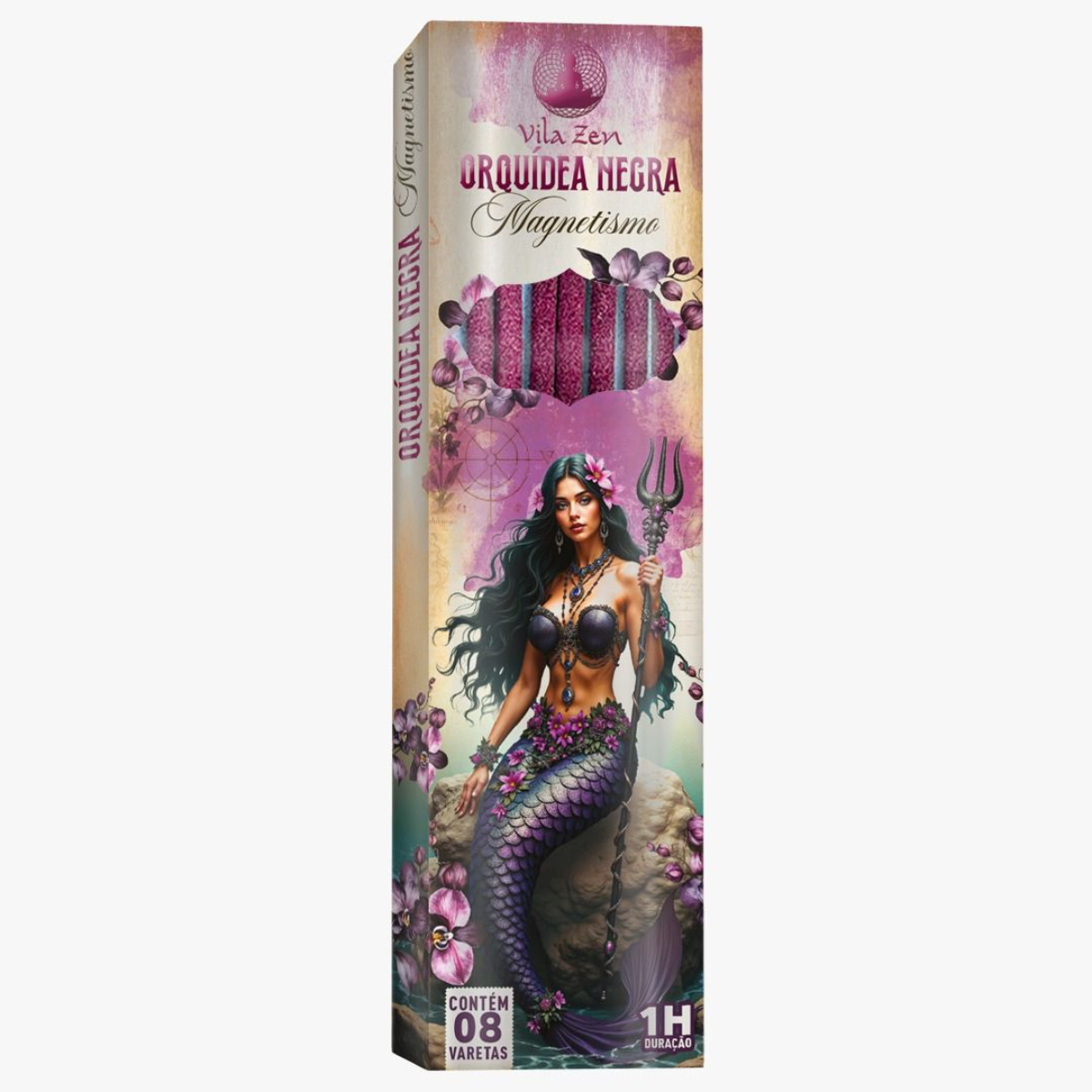 O Incenso em Varetas Orquídea Negra Magnetismo da marca Via Zen é um produto místico e aromático projetado para despertar o Magnetismo pessoal, a atração e o poder interior de quem o utiliza. Sua embalagem, rica em tons de roxo e preto, ilustra uma sereia de cabelos escuros em um cenário noturno, rodeada por orquídeas negras, sugerindo um aroma profundo, sensual e envolvente, que atua na elevação da autoestima e da sedução. Cada caixa contém 08 varetas de queima prolongada (aproximadamente 1 hora de duração), sendo ideal para rituais de manifestação, momentos de autoconexão e para a criação de um ambiente de fascínio e mistério.