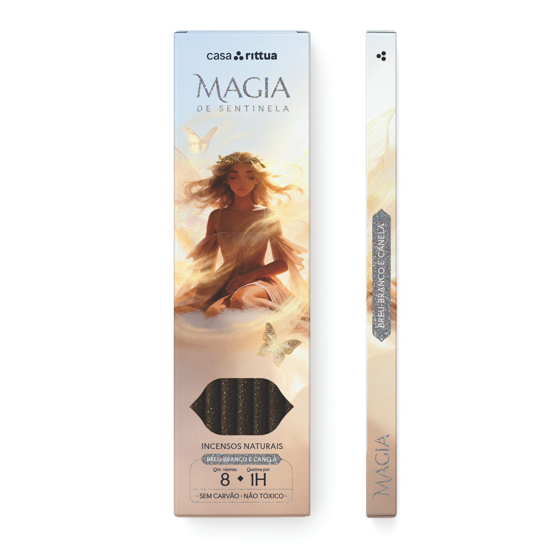 Este incenso natural da linha Magia de Sentinela, produzido pela Casa Rittua, apresenta a combinação aromática de Breu-Branco e Canela. Ele é formulado para auxiliar na elevação da vibração energética do ambiente e na purificação profunda através das propriedades resinosas do breu-branco, enquanto a canela atua como um estimulante para atrair prosperidade e dinamismo. O produto contém 8 varetas com tempo de queima de aproximadamente 1 hora cada, sendo uma opção livre de carvão e não tóxica para quem busca proteção espiritual e fortalecimento do poder de manifestação pessoal.