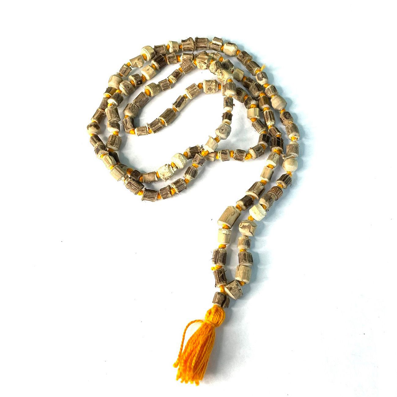 Tulasi ou Tulsi é considerada uma planta sagrada e muito auspiciosa na cultura indiana, onde lhe atribuem o poder de propriedades curativas físicas e espirituais notáveis, e que ajudam a melhorar a meditação. O tulsi mala é muito usado para adorar Ram, Krishna e especialmente Vishnu e nas praticas yogues de meditação mântrica. Feito na Índia com nós tradicionais entre as contas.