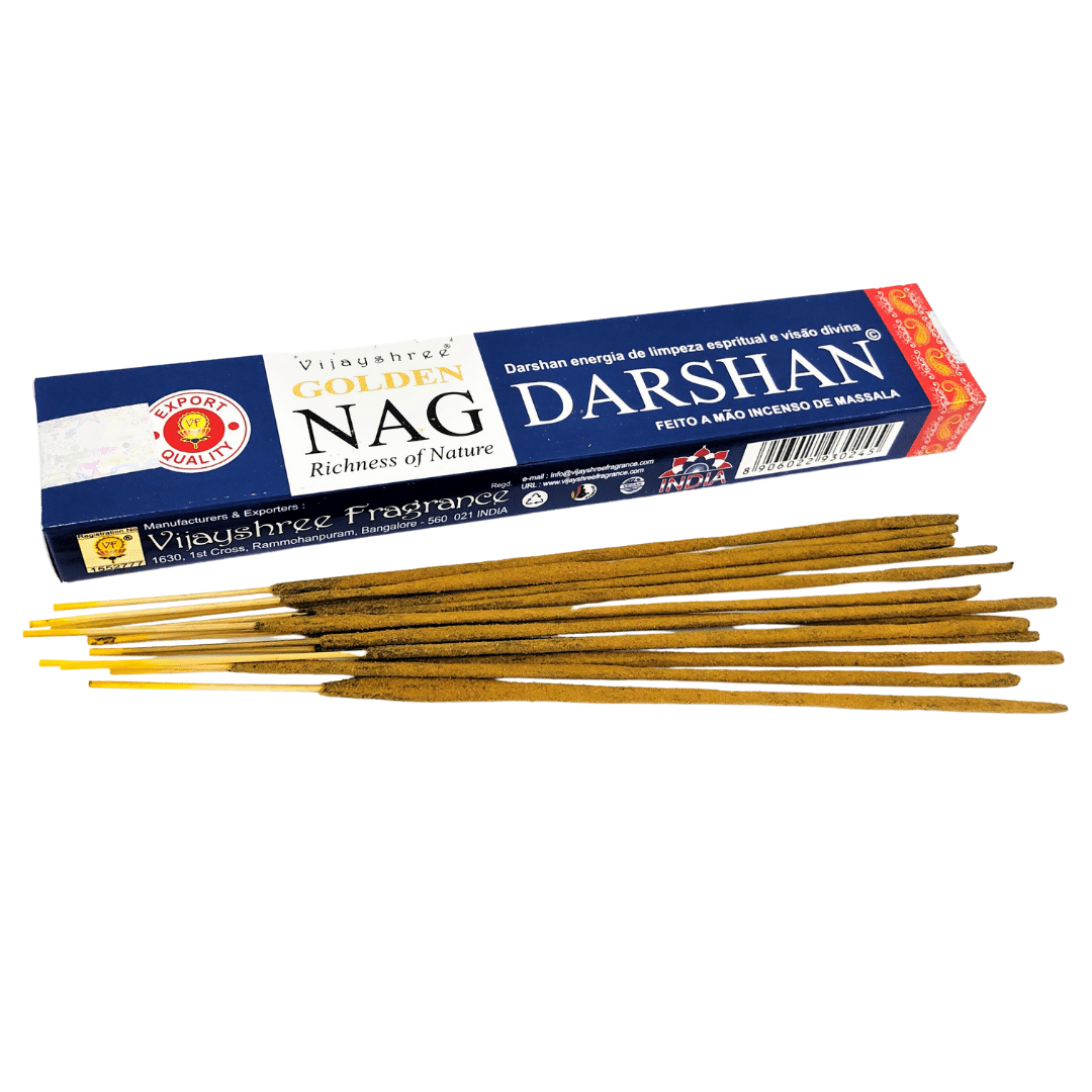 O Incenso Indiano de Massala Golden Nag Darshan tem um aroma bem amadeirado com um toque cítrico. Ele é muito utilizado para renovação da energia do ambiente, espiritual e divina, além de revitalizar a espiritualidade.