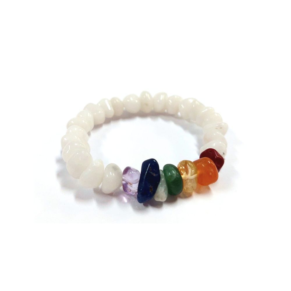 Pulseira Pedra Cascalho 07 Chakras - Quartzo Branco O Quartzo Branco é um Cristal de remete a Sabedoria e a Cura. Este cristal purifica as energias do ambiente e de seu portador, protege nos sonhos e melhora muito os casos de insônia. Sua vibração especial também afasta as más influências e todos tipos de ataques energéticos. Segundo a tradução sânscrito, Chakra significa "roda de luz". No Hindu, é conhecido como o centro de absorção e controle de energias e simbolizam os diferentes "corpos" que estão presentes no ser humano, como o físico, o mental, o emocional e o energético. Estes estão localizados ao longo da coluna vertebral. Os chakras são contados de baixo para cima, começando pelo base da coluna vertebral. Ele segue as cores do arco-íris e possuem diferentes significados: VERMELHO: estimula o instinto, segurança e a flueza; LARANJA: estimula a alegria, libertação e a paciência; AMARELO: estimula poder, controle e autoestima; VERDE: desperta o amor, a compaixão e o perdão; AZUL: estimula a comunicação e a expressão; ROXO: desperta a intuição e a percepção sobre determinadas atitudes; ROSA: estimula a transcedência e a espiritualidade; A Pulseira Pedra Cascalho 07 Chakras - Quartzo Branco é um ótimo acessório para o dia a dia que permite manter seu campo áurico distante de más vibrações.