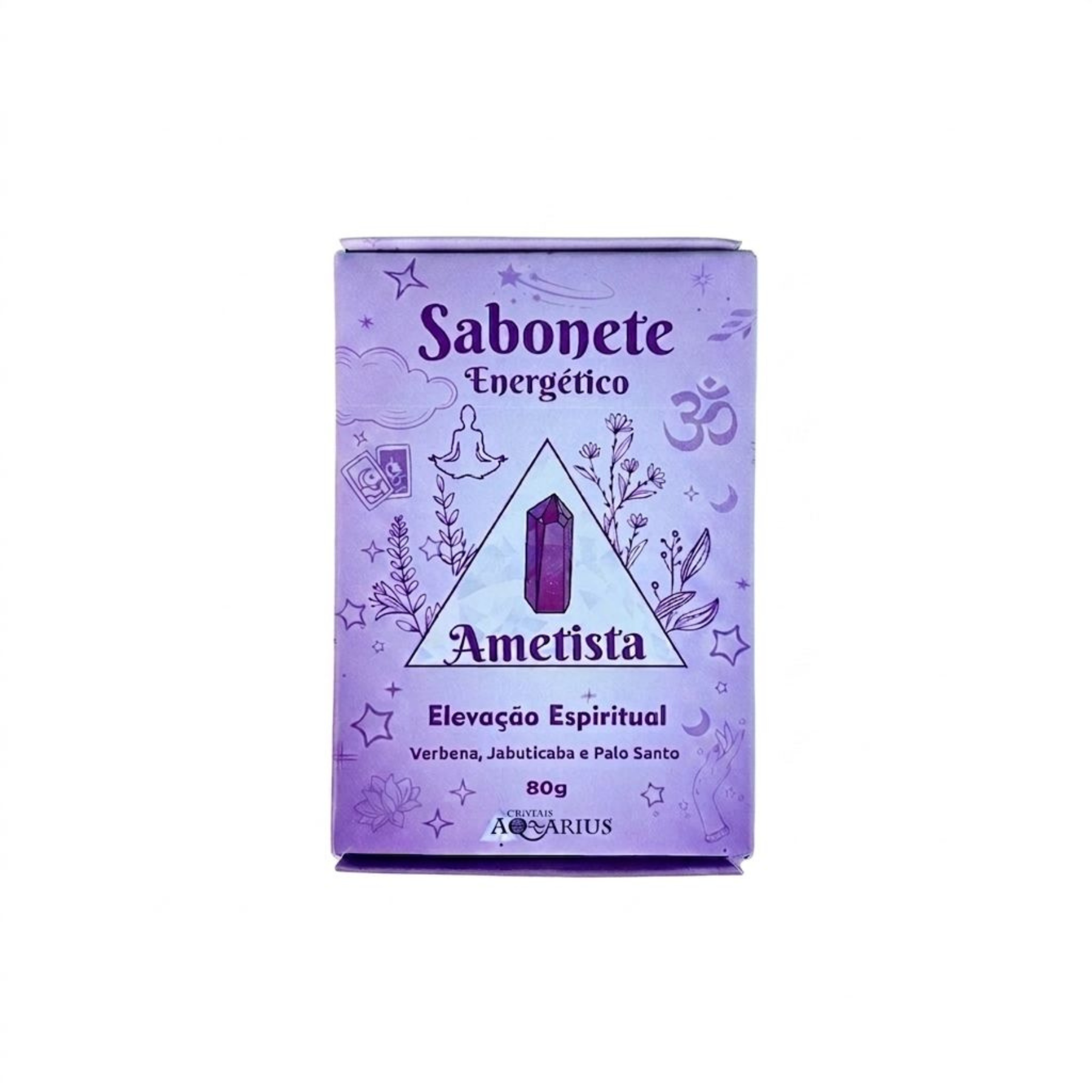 O Sabonete Energético de Ametista é apresentado em uma embalagem de 80g com um design místico em tons de lilás, focado na temática de Elevação Espiritual e conexão interior. A caixa é ricamente decorada com símbolos como o Om, cartas de tarô, uma figura em meditação e elementos botânicos, destacando uma ilustração central do cristal Ametista dentro de um triângulo. Sua fragrância e composição combinam as notas refrescantes e sagradas de Verbena, Jabuticaba e Palo Santo. Através da energia da Ametista, este sabonete atrai a transmutação de energias negativas em positivas, promovendo a clareza mental, a intuição e o equilíbrio emocional. É ideal para quem busca atrair um estado de paz profunda e serenidade, facilitando a conexão com o plano espiritual e a purificação da aura durante o banho.