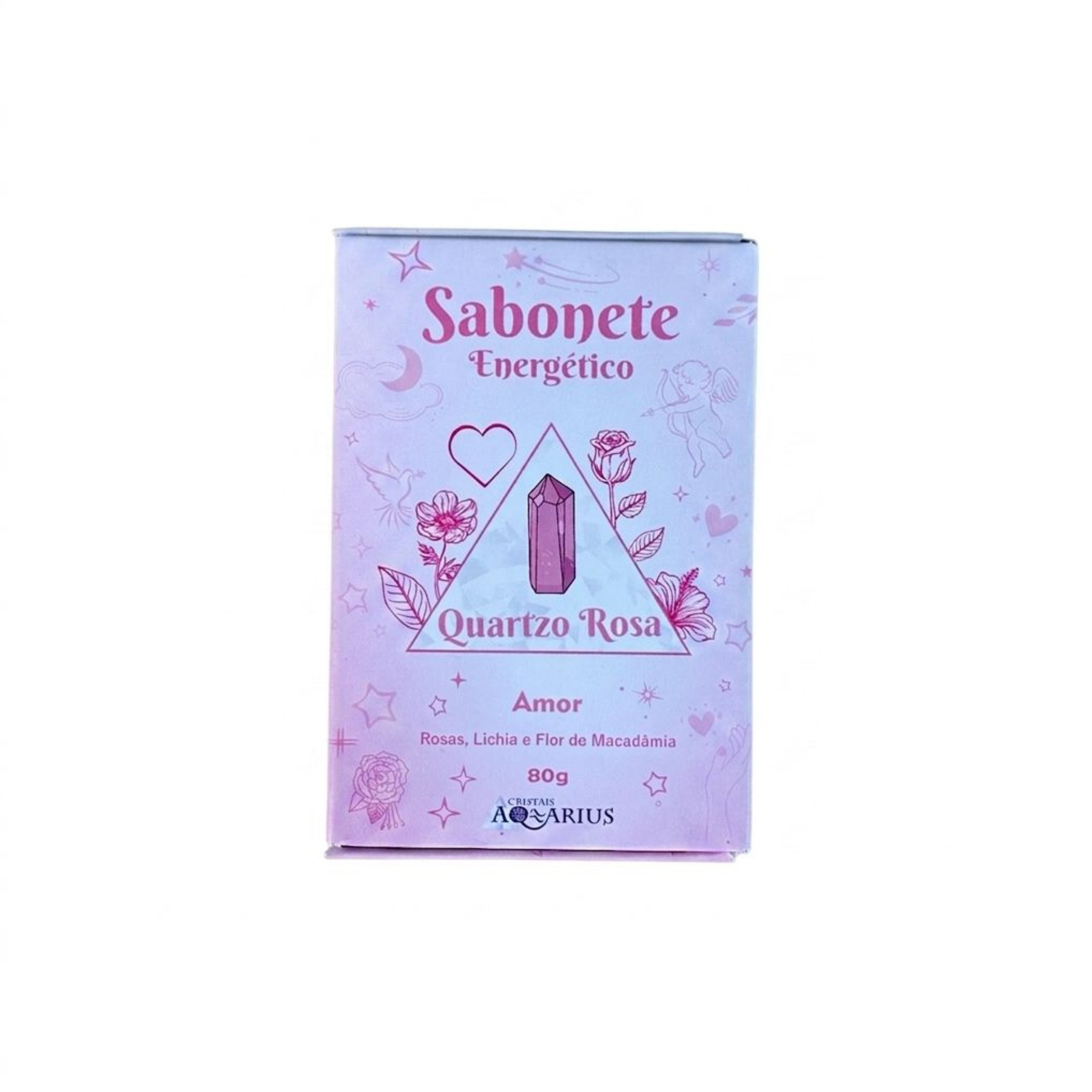 O Sabonete Energético de Quartzo Rosa é apresentado em uma embalagem de 80g com um design místico e romântico em tons de rosa, focado na temática do amor e do autocuidado. A caixa traz uma ilustração central do cristal Quartzo Rosa emoldurado por flores e um coração, evocando uma sensação de ternura e afeto. Sua composição combina notas florais e frutadas de Rosas, Lichia e Flor de Macadâmia.
